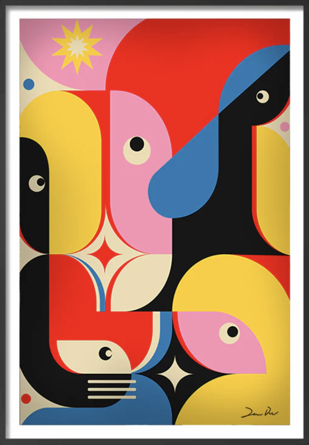 Description of Art: Be Curious typifies Jen Du’s signature geometric abstraction—bold, structured, and playful. The composition likely features interlocking shapes and vibrant color contrasts, arranged to evoke movement, tension, and visual harmony. The elements of architecture, pattern, and abstract form seem to merge, guiding the viewer’s eye through fluctuating planes and rhythmic geometry.