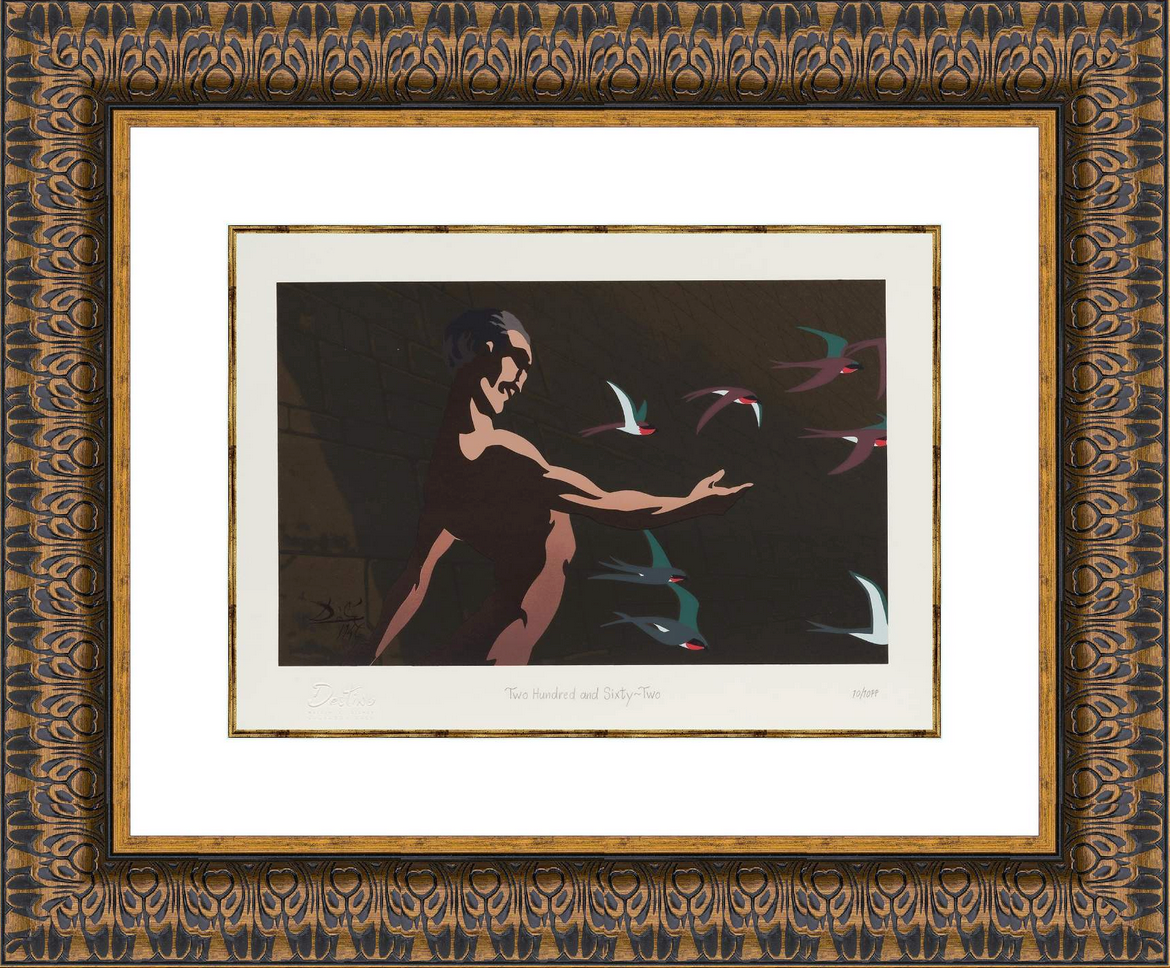 Description of Art: Destino #262 reflects Salvador Dalí’s surreal imagination within the Destino series, presenting a fluid and symbolic composition shaped by transformation, fate, and subconscious motion. Elongated forms and organic shapes appear to shift and merge, suggesting figures caught in moments of metamorphosis rather than fixed identity. Soft color gradients and delicate line work create a cinematic, dreamlike atmosphere where time feels suspended and emotional logic replaces physical space. The work embodies Dalí’s poetic vision of destiny, transforming inner experience and surreal symbolism into a visual meditation on change, desire, and inevitability.