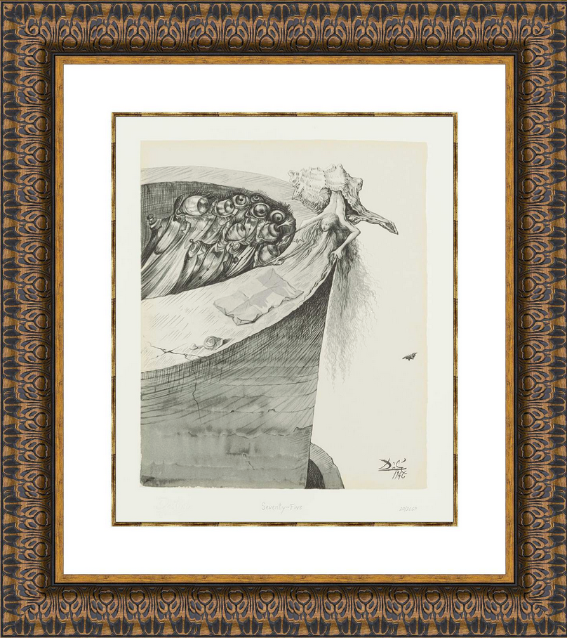 Description of Art: Destino #75 reflects Salvador Dalí’s surreal exploration of fate and transformation within the Destino series, presenting a fluid, dreamlike composition where forms appear to stretch, dissolve, and evolve in a timeless space. Elongated figures and organic shapes interact through symbolic motion, suggesting desire, inevitability, and the subconscious forces that guide human experience. Soft color transitions and delicate line work create a cinematic atmosphere, reinforcing a sense of suspended reality and poetic movement. The work captures Dalí’s fascination with destiny as an ever-shifting process, transforming inner emotion and mythic symbolism into a visual meditation on change and imagination.