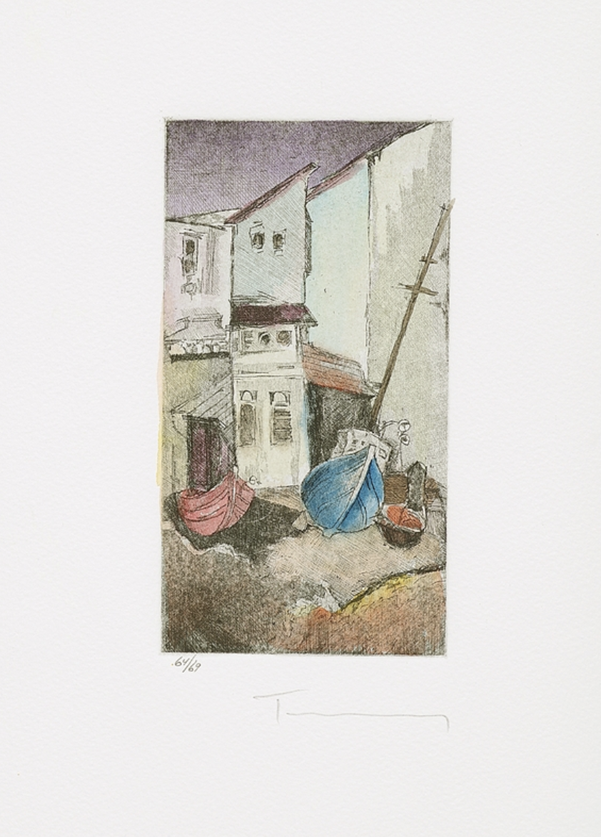 The central figure (or figures) may stand or recline near a dock’s edge, enveloped in soft folds of fabric that catch ambient light and motion. The background—suggested rather than elaborated—might display moored yachts, riggings, subtle water reflections, and architectural elements abstracted to enhance calmness. Tarkay’s palette is typically gentle and balanced: muted blues, sandy beiges, warm creams, and soft pinks, contrasted with occasional accent colors.