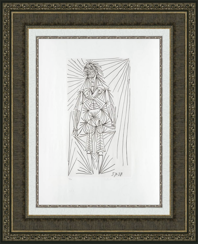 Marina Picasso’s edition captures the original’s balance between solidity and economy—areas of shadow and light are handled with measured tonal washes rather than heavy modeling. Negative space plays a role, allowing the figure to breathe within the frame. The print’s texture and line work echo the original’s energy while clearly showcasing the geometry of form.