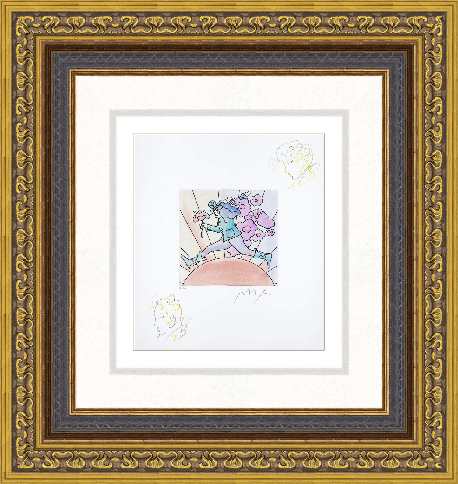 Description of Art: In Flower Jumper Over Sunrise, Peter Max captures a moment of buoyant flight above sun-lit horizons and a cascade of blossoms. An emblematic figure leaps freely across a field of light, clutching a flower as rays of the sun fan outward behind them. The vivid palette—bright yellows, radiant oranges, greens and pinks—alongside crisp outline and simplified form evoke a celebration of optimism and transcendence. This work channels Max’s ‘Cosmic ’60s’ aesthetic, re-imagined at the turn of the 21st century, turning a joyful springing gesture into a symbol of freedom and renewal.