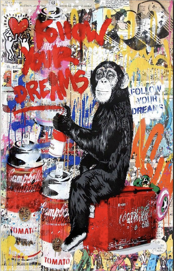 Description of Art: Follow Your Dreams – Monkey is a provocative and satirical work attributed to the elusive British street artist Banksy, known for his politically charged and subversive imagery. This piece features one of Banksy’s recurring characters—a forlorn monkey—combined with the stenciled phrase “Follow Your Dreams.”