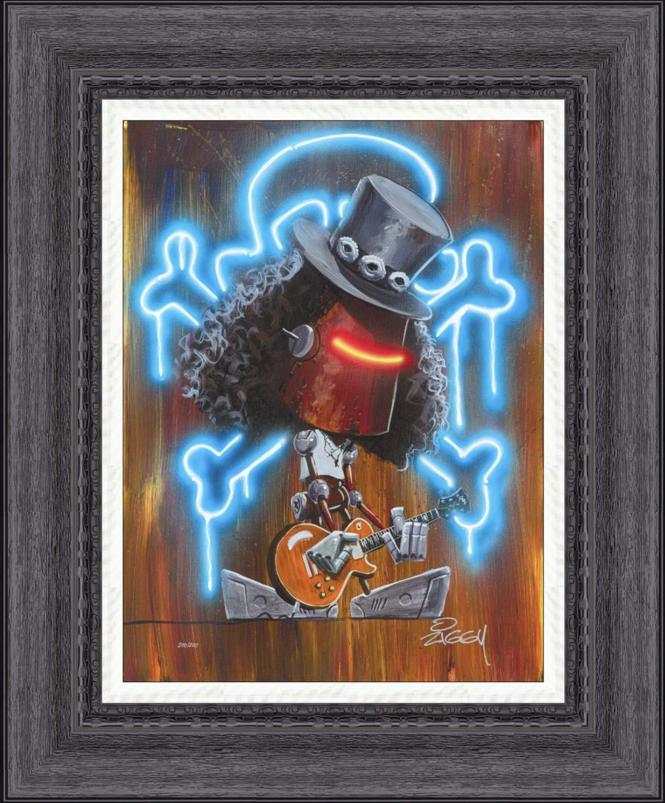 Description of Art: G N R Rusty merges Ziggy’s bold pop-surreal imagery with a nod to rock iconography. The work likely portrays either a stylized figure or symbol evocative of Guns N’ Roses (“G N R”)—perhaps a guitar, skull motif, roses, or a fusion of those elements—rendered in Ziggy’s signature color palette and graphic contrast. The title “Rusty” suggests a theme of decay, patina, or weathered texture, so one might expect metallic tones, distressed surfaces, or layered paint effects that evoke rust or aging.