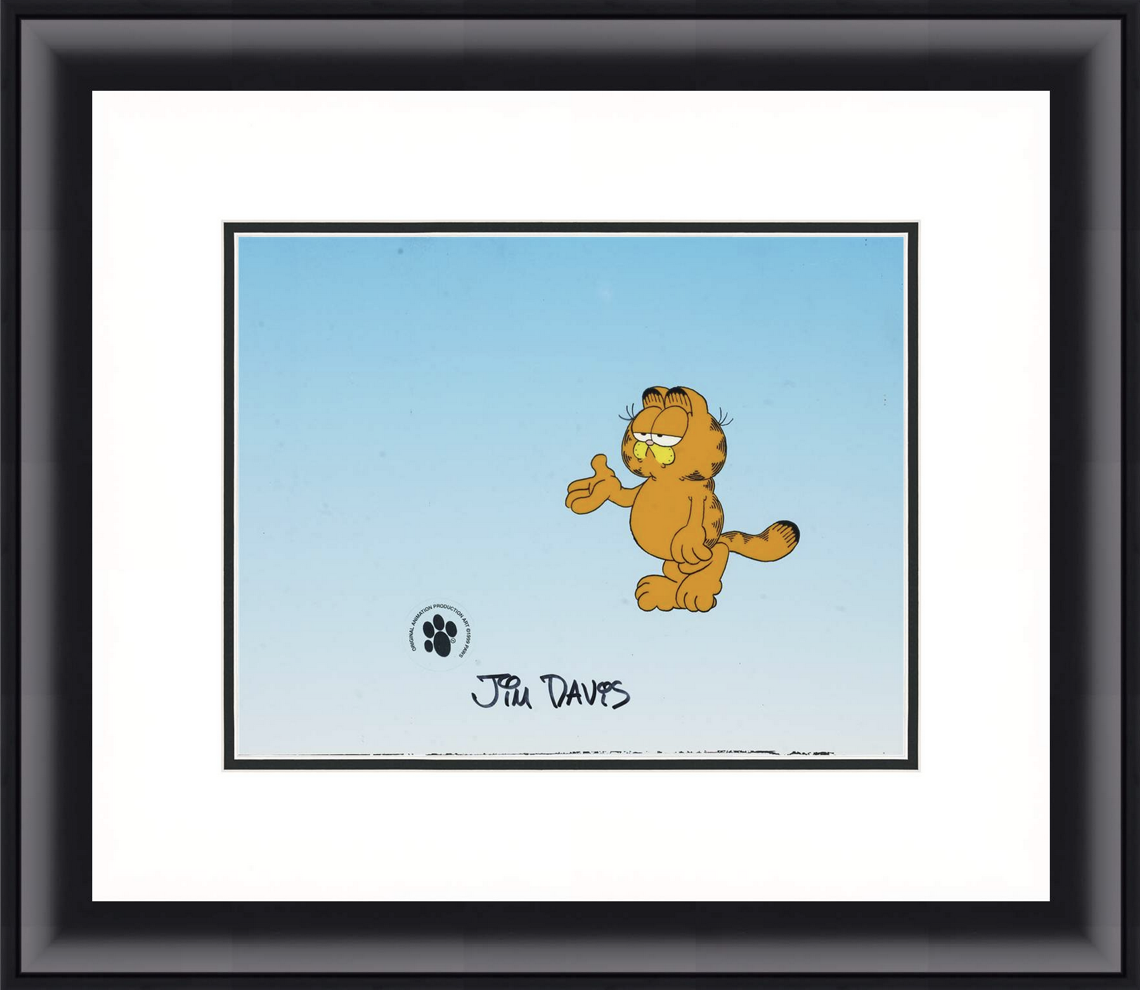 As a sericel or cel, parts of the piece may be hand-painted acetate layered over printed backgrounds or outlines; shadows and highlights may be minimal but used to emphasize facial contours and folds. The overall tone is humorous and light, capturing a snapshot of Garfield’s comedic persona in a moment of exaggerated need.