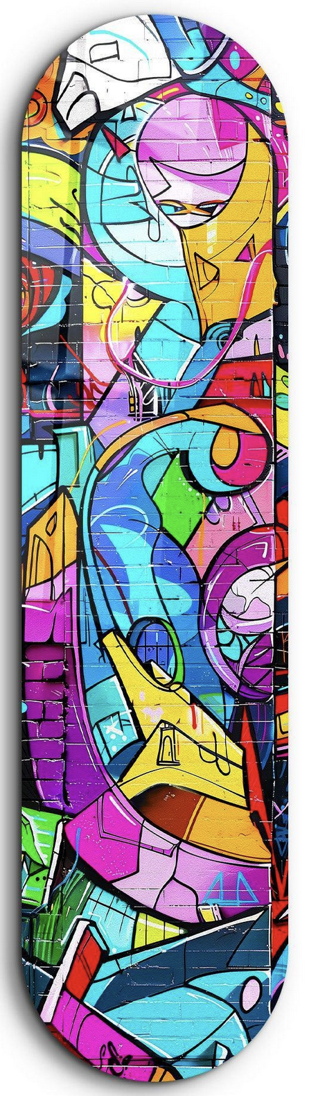 Description of Art: Graffiti Abstract is a vibrant, street-art inspired piece realized through glass printing. The composition layers dynamic strokes, drips, and splashes of color—neons, blacks, whites, and bold accents—to evoke the energy and motion of urban graffiti. Abstract shapes and overlapping gestures lend visual rhythm, while the tempered glass surface intensifies color saturation and adds depth through reflection.