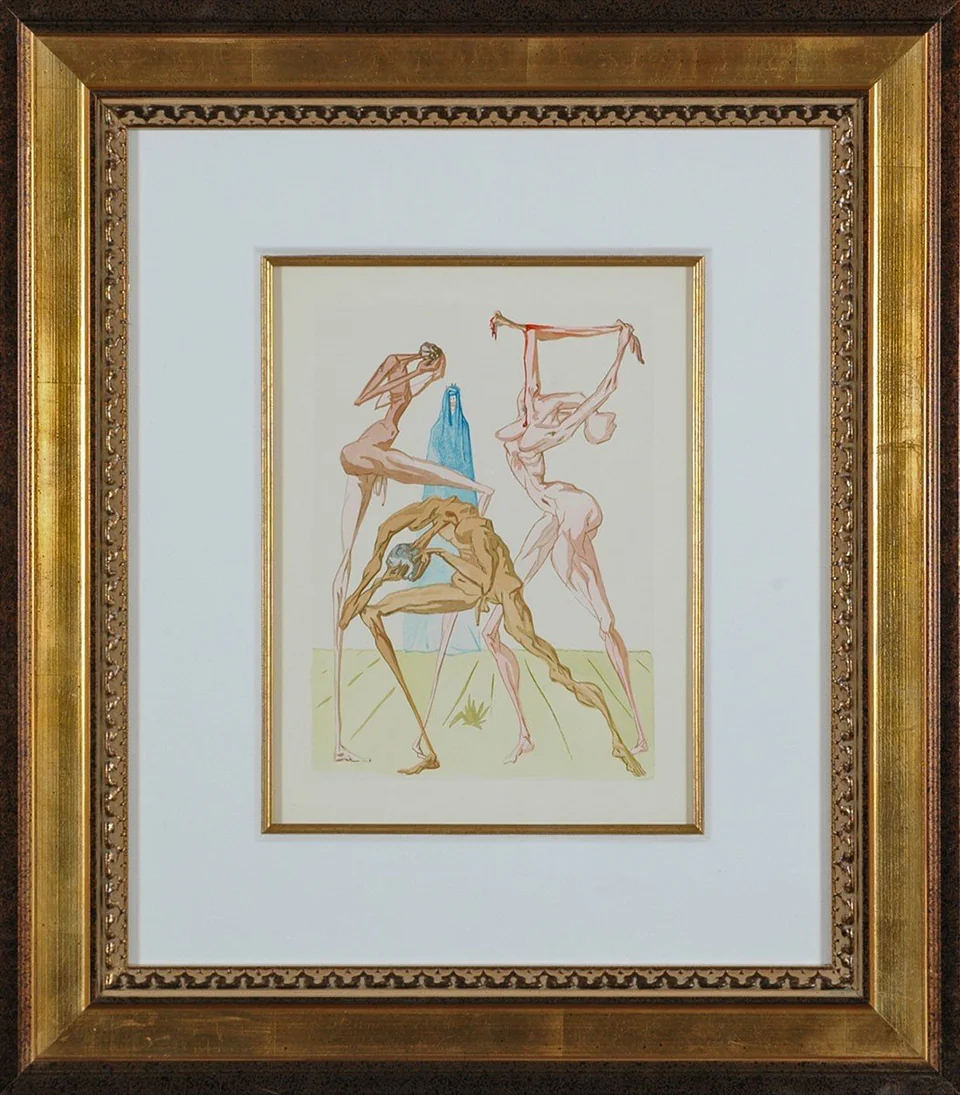 Dalí distills the essence of Canto 15 into a moment of solemn encounter—a vision where suffering is borne with grace, where dignity survives within punishment, and where the Inferno reveals a rare quietness amid its violence. It is a scene shaped by heat and restraint, capturing the haunting balance between endurance and sorrow at the heart of this canto.