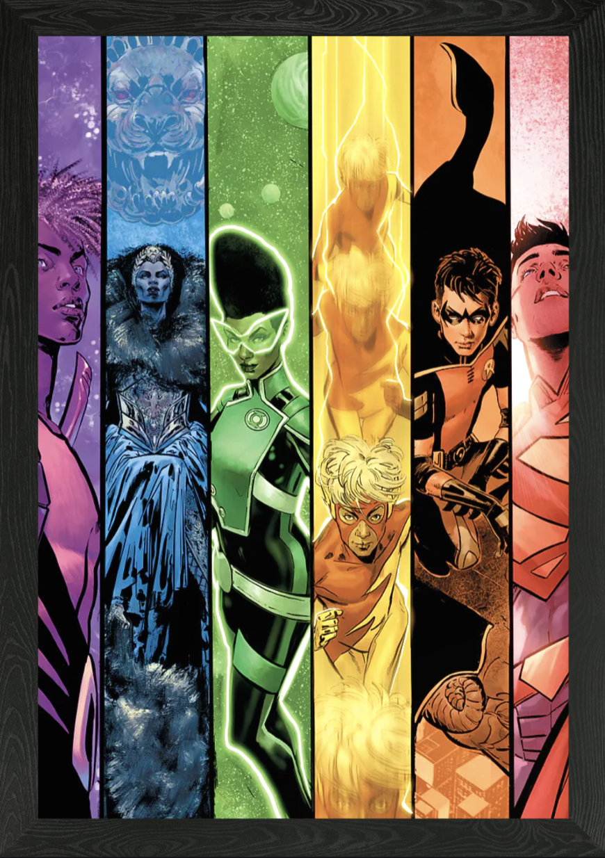 Together, the poster distills the essence of DC’s heroic legacy: individual stories converging into a shared symbol of protection, resilience, and aspiration. It is a scene shaped by dynamic color, commanding silhouettes, and a sense of myth elevated into contemporary iconography. The result is a celebration of the heroic ideal—grand, bold, and unwavering.
