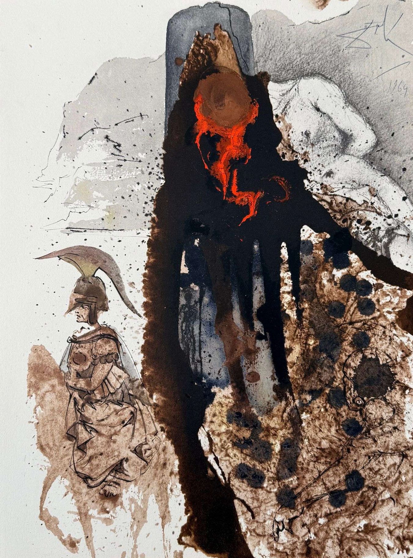 Description of Art: Jesus Scourged from the Biblia Sacra suite reflects Salvador Dalí’s intense and dramatic approach to sacred imagery, presenting the moment of Christ’s suffering with emotional gravity and surreal sensitivity. The figure of Jesus is rendered with elongated form and expressive posture, emphasizing vulnerability, endurance, and spiritual sacrifice rather than physical brutality alone. Dalí’s use of stark contrasts, restrained color, and symbolic space heightens the sense of isolation and pain, allowing the scene to resonate on both human and divine levels. The composition transforms the biblical narrative into a contemplative vision of suffering and redemption, merging traditional Christian subject matter with Dalí’s unmistakable surrealist language and spiritual depth.