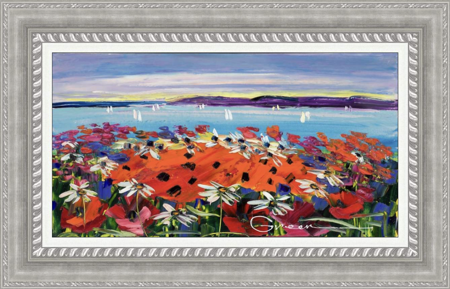 Description of Art: Lake View VII captures the tranquil beauty of water and landscape through Maya Green’s signature impressionistic style. The composition portrays a serene lake, its surface shimmering with layered brushstrokes that suggest light rippling across the water. Surrounding elements—trees, sky, or shoreline—are rendered with fluid movement and soft transitions, evoking the atmospheric calm of nature at rest.