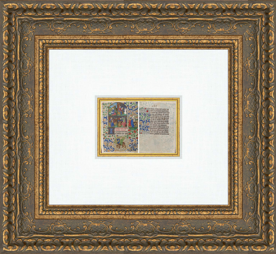 Description of Art: Leaf from a Book of Hours reflects the refined craftsmanship and devotional purpose of medieval illuminated manuscripts, created for private prayer and contemplation. Delicate script, ornamental borders, and richly colored imagery work together to guide the reader’s meditation, blending text and image into a unified spiritual experience. Gold accents, intricate patterns, and carefully balanced compositions elevate the page beyond function, transforming it into an object of beauty and reverence. The leaf captures the intimate relationship between art and faith in the medieval world, where illumination served both as visual splendor and a pathway to devotion.