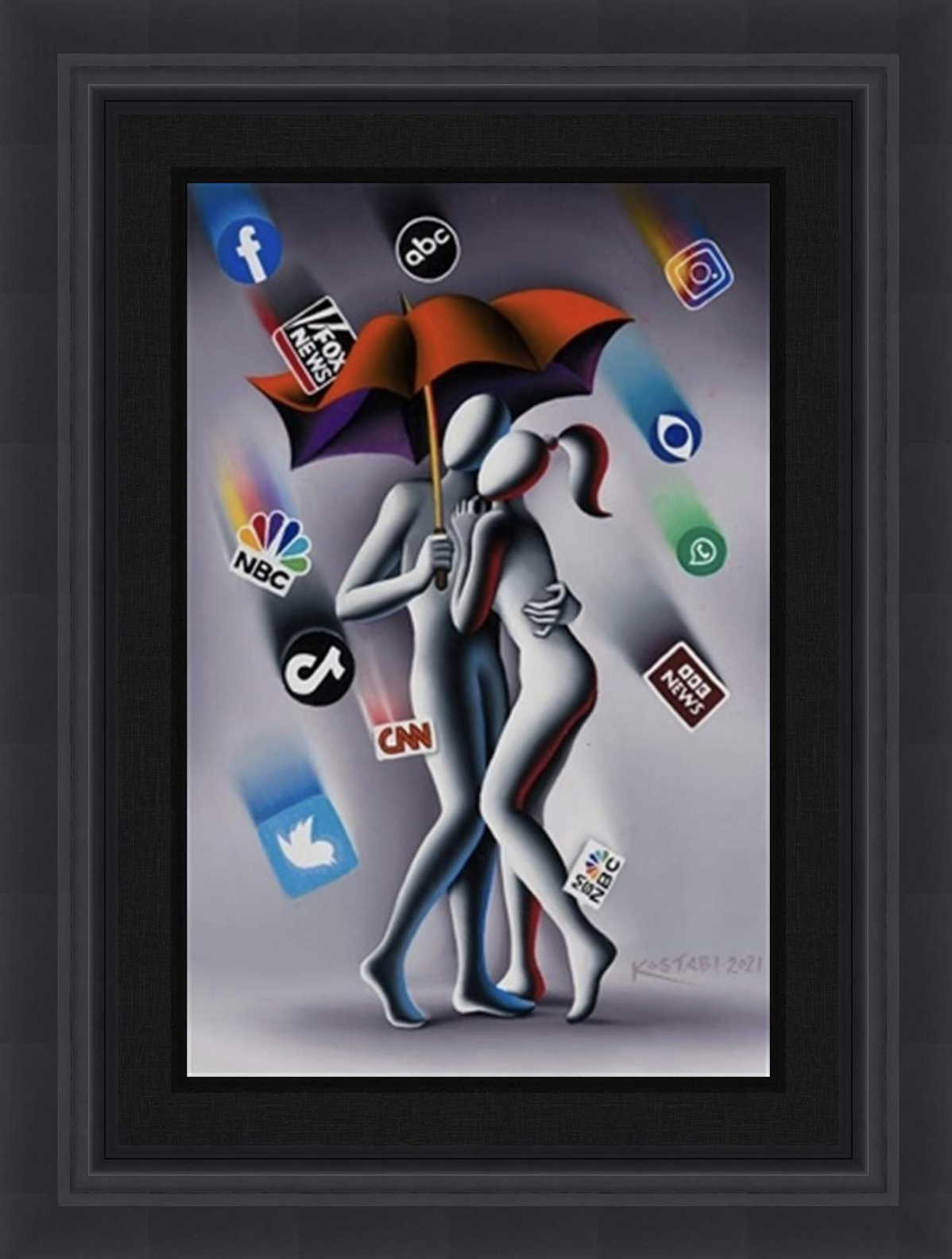 Description of Art: Media Shower presents Mark Kostabi’s iconic faceless figures immersed in a cascade of imagery and information, reflecting the overwhelming presence of media in contemporary life. The figures, smooth and mannequin-like, are positioned as both participants and subjects within this visual downpour—gesturing upward, shielding themselves, or passively absorbing the flow. Their simplified anonymity emphasizes universality, suggesting that the experience belongs to all of us in the modern age.