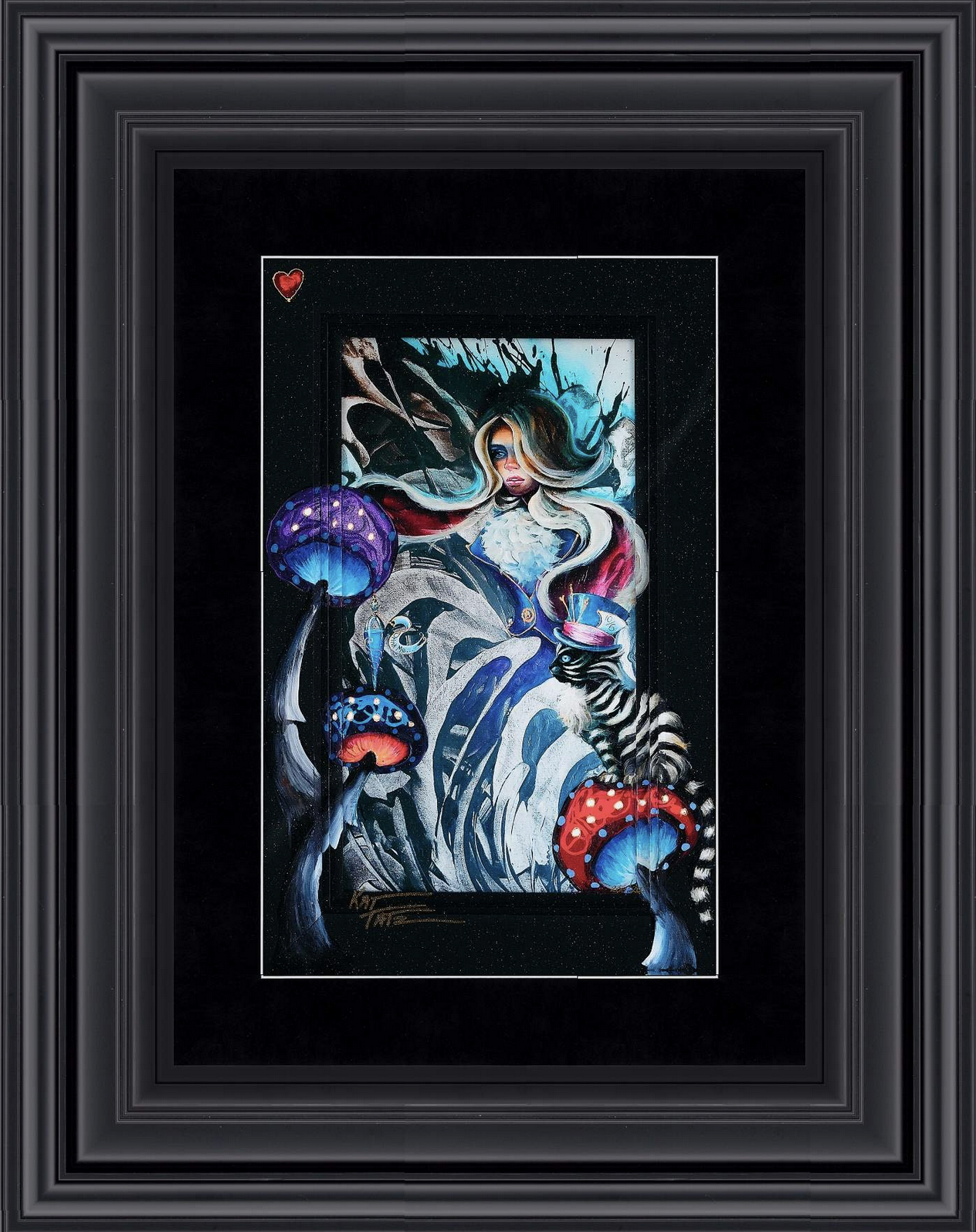 Description of Art: Mind Blown stages a theatrical moment of revelation in Kat Tatz’s whimsical, surreal idiom. A central figure—stylized and costumed—appears amid luminous, candy-toned color fields and ornate graphic flourishes. Crisp contours, vintage-inflected motifs, and a softly glowing palette heighten the sense of wonder, while the composition’s title cues a narrative of sudden insight or transformation. The result is a polished, storybook vignette that blends fantasy and introspection—signature traits of Tatz’s practice.
