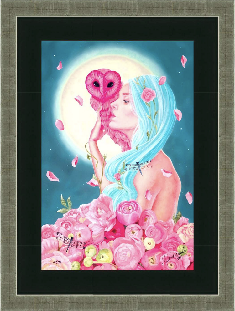 Description of Art: Moon Goddess presents a luminous, ethereal figure rendered in Melanie Stimmell’s distinctive style: a young woman gazes outward, her hair flowing and her form surrounded by symbolic lunar elements. The central figure is crowned by a crescent moon halo, while soft lighting and gentle color transitions evoke a serene nocturnal atmosphere. Stimmell’s brushwork—delicate yet confident—and her use of luminous highlights give the piece a sense of quiet reverence and mythic presence. The caldograph medium on wood adds subtle texture and warmth, enhancing the tactile quality of the print. The artwork invites reflection on femininity, intuition, and the mystery of night.