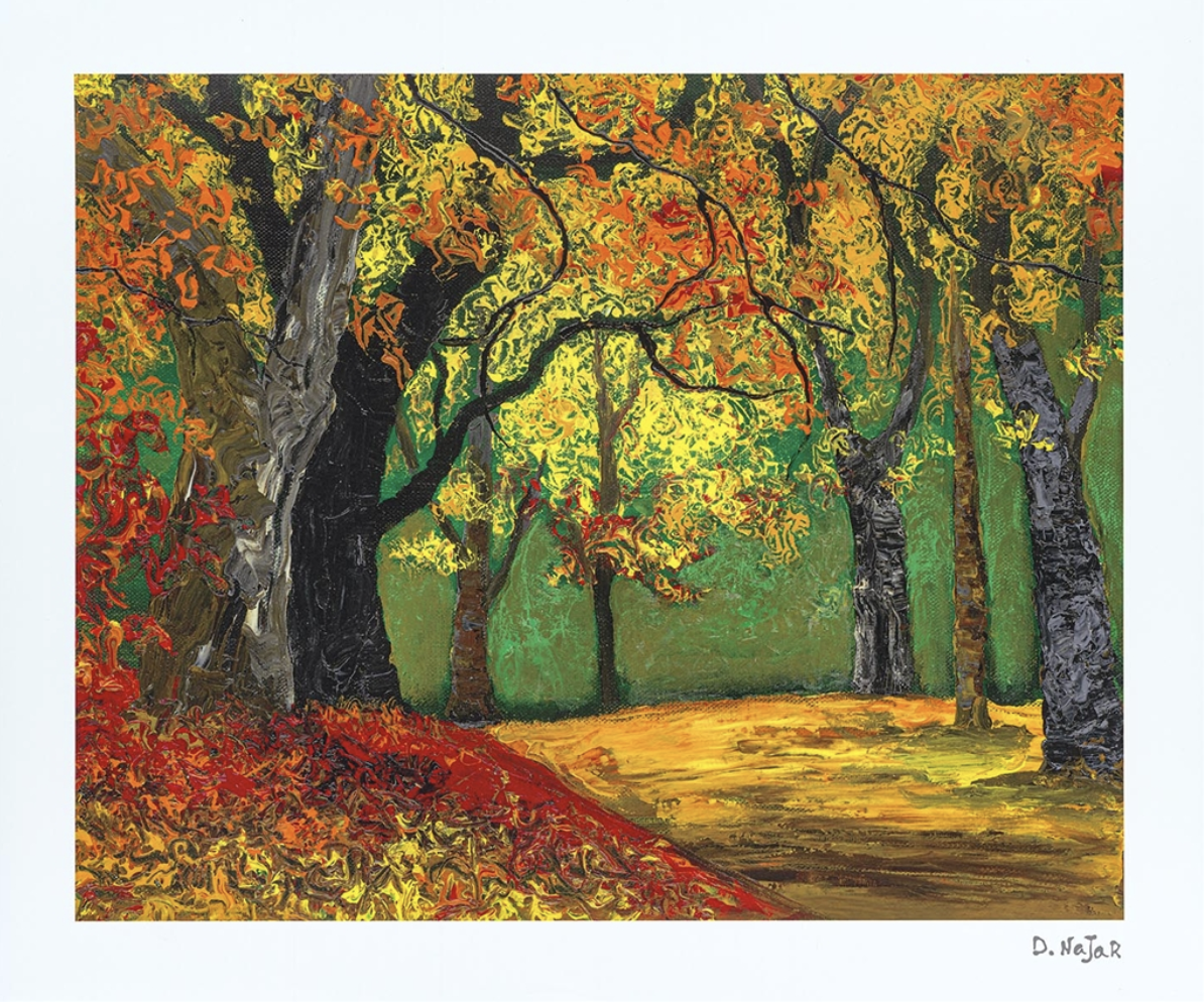 In this work, Najar’s palette leans toward harmonious naturals—gentle greens, pale golds, soft browns, muted blues—accented by subtle contrasts that draw the eye along visual paths. His touch blends realism and abstraction: trees and foliage may appear defined at the edges but dissolve into atmospheric wash deeper into the scene. The lithograph medium, with possible varnish touches, gives selected areas a luminous sheen, offering the piece an inner glow.