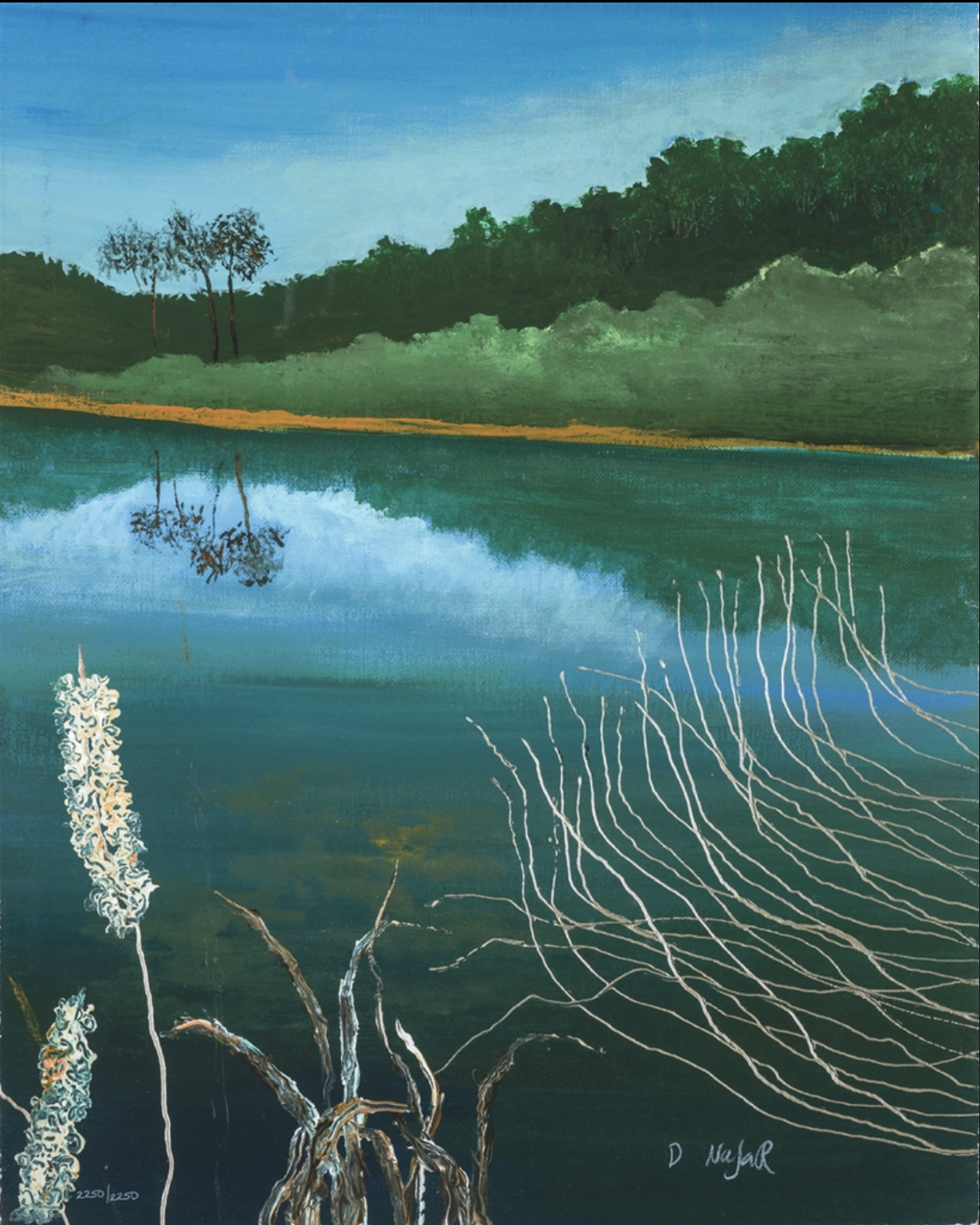 Description of Art: Perfectly Calm embodies the tension between stillness and latent movement, capturing a quiet moment in nature as if paused in a reverie. The composition is likely landscape-oriented, with natural elements—trees, water, sky, possibly reflections—treated with luminous color and subtle texture. Najar often works in oil or acrylic, layering paint in such a way that light seems to filter through the surface, giving the work depth and a gentle sense of motion.