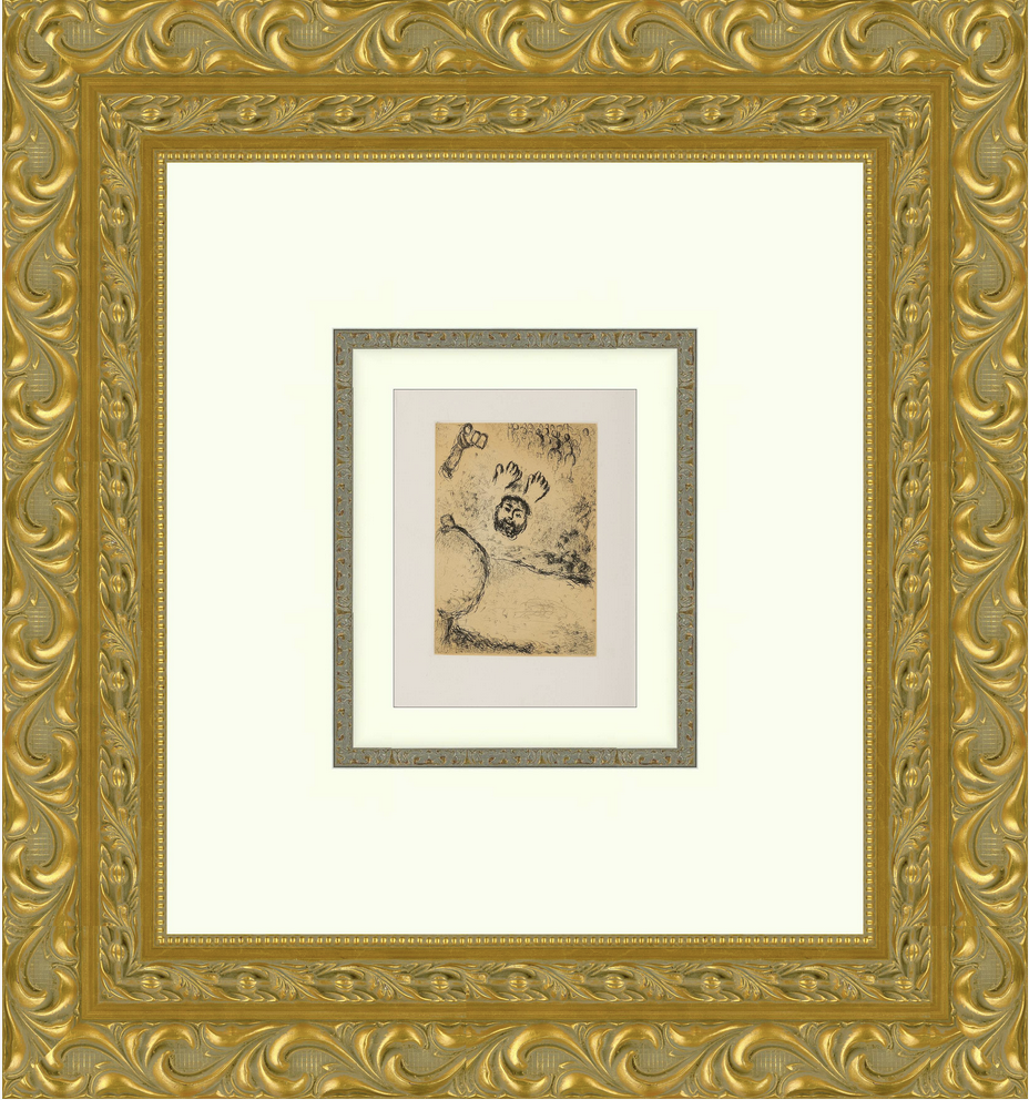 Description of Art: Psalms of David Plate 24 reflects Marc Chagall’s deeply poetic and spiritual vision, presenting a symbolic meditation on faith, endurance, and trust in the divine. Floating figures and sacred imagery appear suspended in a dreamlike, weightless space, suggesting prayer and inner devotion rather than literal narrative. Chagall’s expressive line work and luminous blues, enriched with gentle warm accents, create an atmosphere of reverence tempered by hope and emotional tenderness. The plate transforms the Psalm into visual poetry, capturing its spiritual essence through symbolism, memory, and Chagall’s unmistakable mystical imagination.