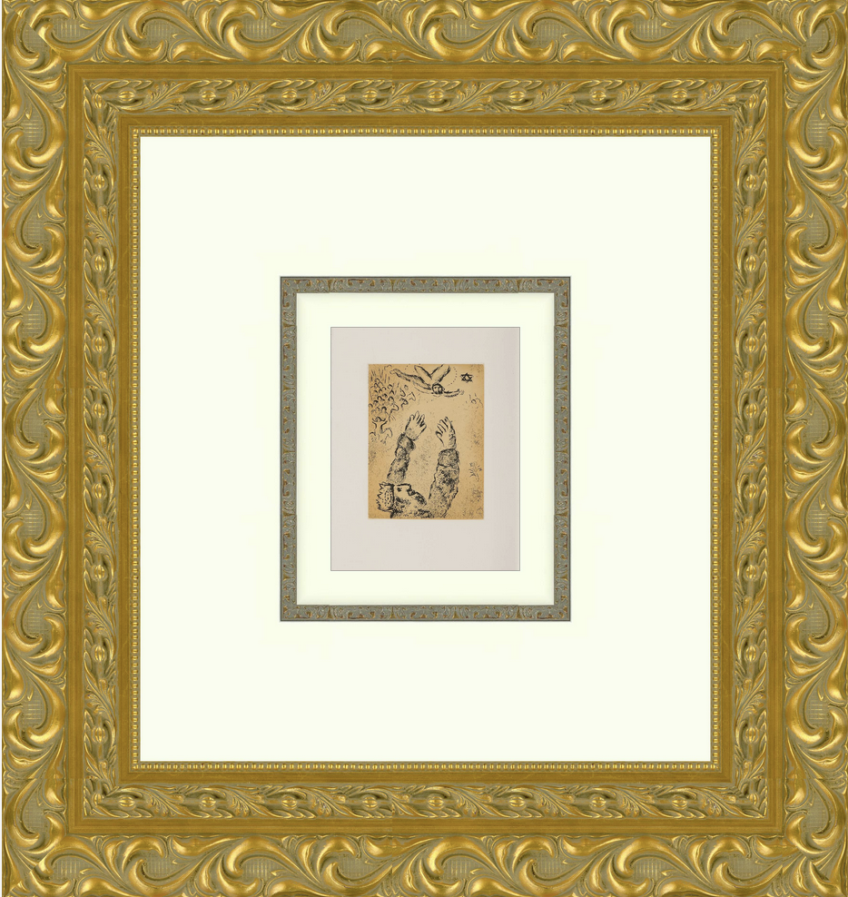 Description of Art: Psalms of David Plate 28 reflects Marc Chagall’s deeply poetic and spiritual language, presenting a symbolic vision of praise, endurance, and trust in the divine. Figures and sacred imagery float within a dreamlike, weightless space, suggesting prayer and inner devotion rather than literal storytelling. Chagall’s expressive line work and luminous blues, enriched with gentle warm accents, create an atmosphere of reverence and quiet hope. The plate transforms the Psalm into visual poetry, capturing its emotional and spiritual essence through symbolism, memory, and Chagall’s unmistakable mystical imagination.