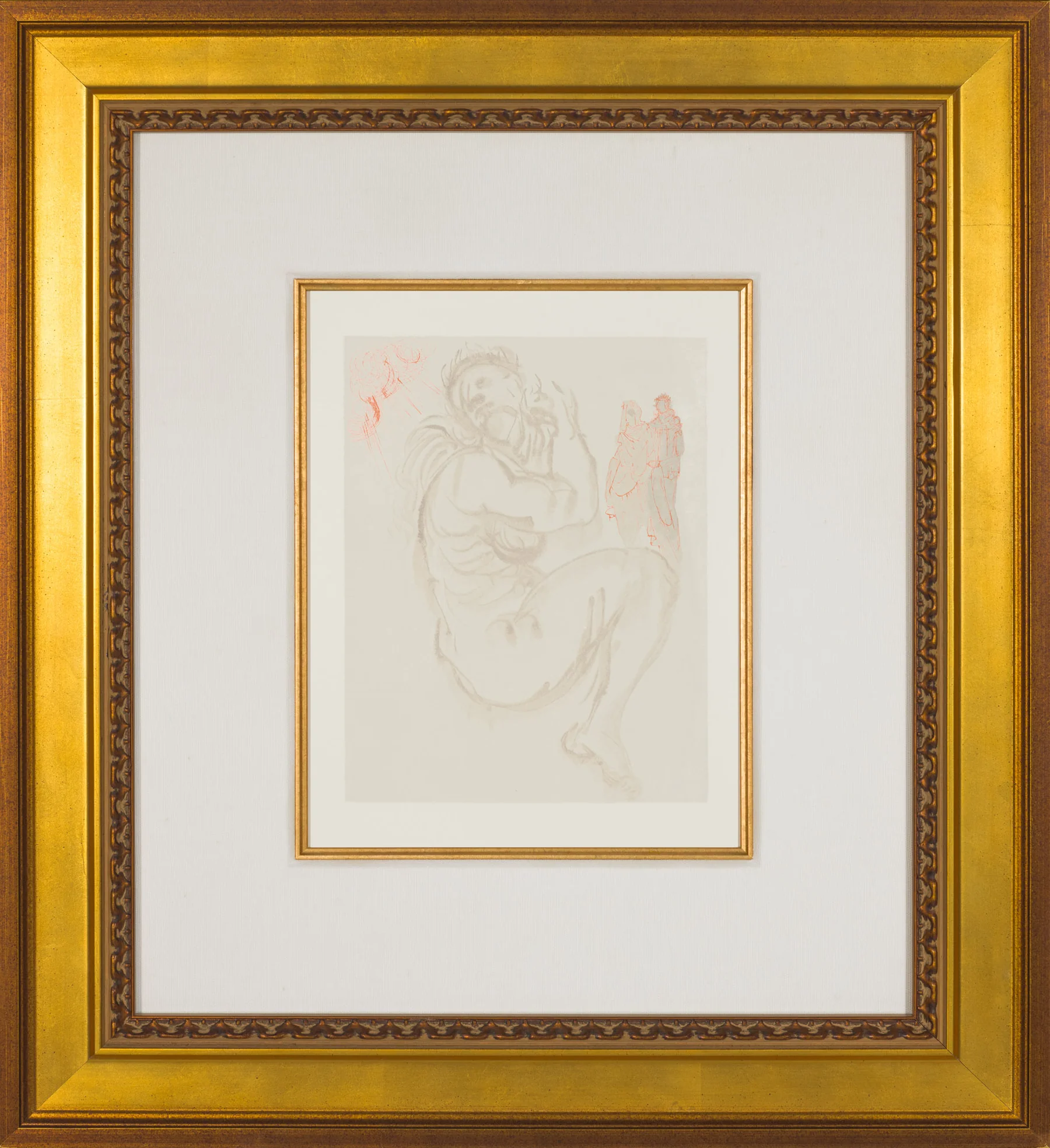 Nearby, the figure of Dante appears more grounded, his posture bent in wary contemplation. His silhouette is delineated with delicate engraving lines, contrasting with the Siren’s vaporous form. Dalí captures the precise moment where recognition begins to dawn—where illusion wavers before truth. In the background, a faint, protective figure hints at the guiding force that intervenes in Dante’s vision, its outline dissolving into streaks of rising light.