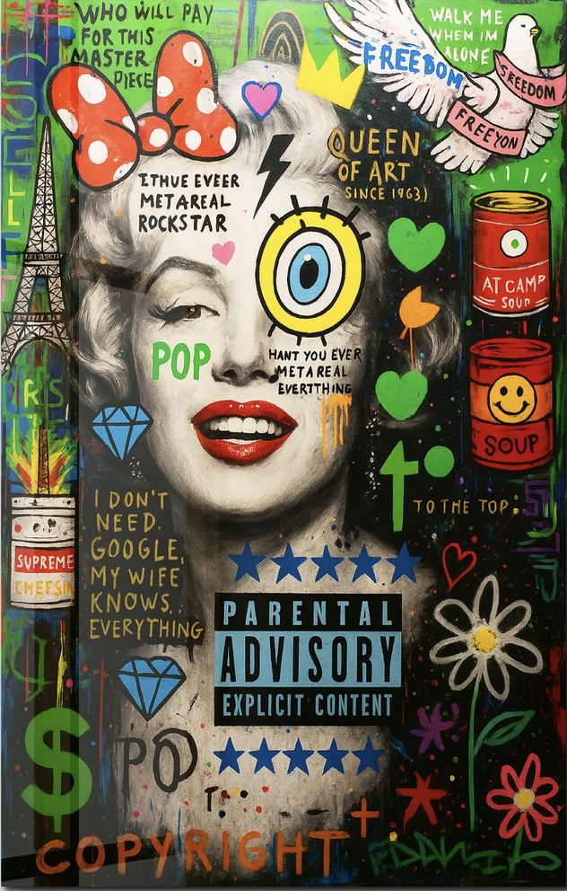 Description of Art: Queen of Pop is a bold, energetic glass print reimagining an iconic portrait through the lenses of graffiti and pop culture. The composition layers expressive sprays, typographic elements, and vivid color fields around the central figure, blending symbolism, nostalgia, and visual audacity. Printed on 4 mm tempered glass, the work has a high-gloss finish that enhances depth and luminosity, making each hue and contour stand out sharply against the sleek surface.