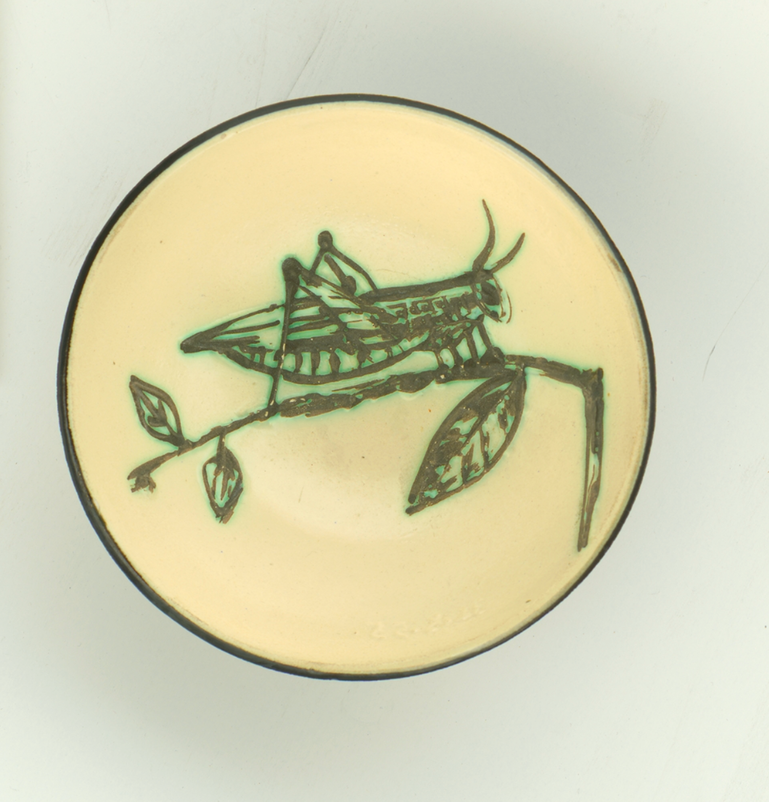 Description of Plate: Sauterelle Sur Une Branche reflects Pablo Picasso’s inventive ceramic practice, transforming a simple natural subject into a bold, modern composition through line, form, and surface. The grasshopper is rendered with expressive, confident strokes, reduced to essential shapes that emphasize movement and character rather than realism. Set against the curved surface of the plate, the image feels lively and spontaneous, as if drawn directly in the moment. Picasso’s playful distortion and graphic clarity turn an ordinary insect into a dynamic symbol of vitality, demonstrating his ability to infuse everyday imagery with wit, energy, and modernist expression.