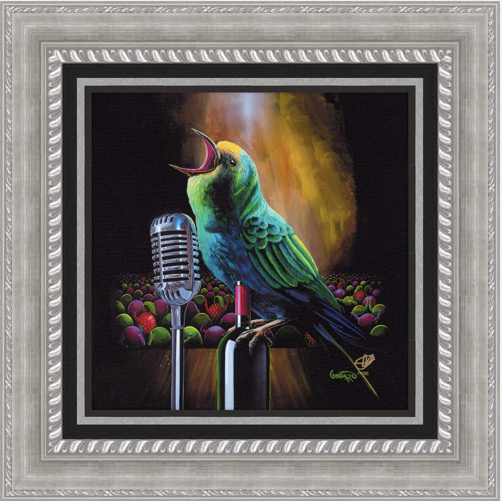 Description of Art: In Singing Audition, Godard captures a whimsical stage moment: a vibrant bird perched on a wine bottle under a spotlight, singing into a vintage microphone, surrounded by scattered berries and a dark stage-like setting. The rich contrasts—emerald green feathers, deep brown backdrop, radiant spotlight—combine with hand-embellished detailing to create visual depth and theatrical presence. The piece balances humor and elegance, inviting the viewer to consider the performance, the subject, and the ironic spectacle of auditioning in a fantastical context.