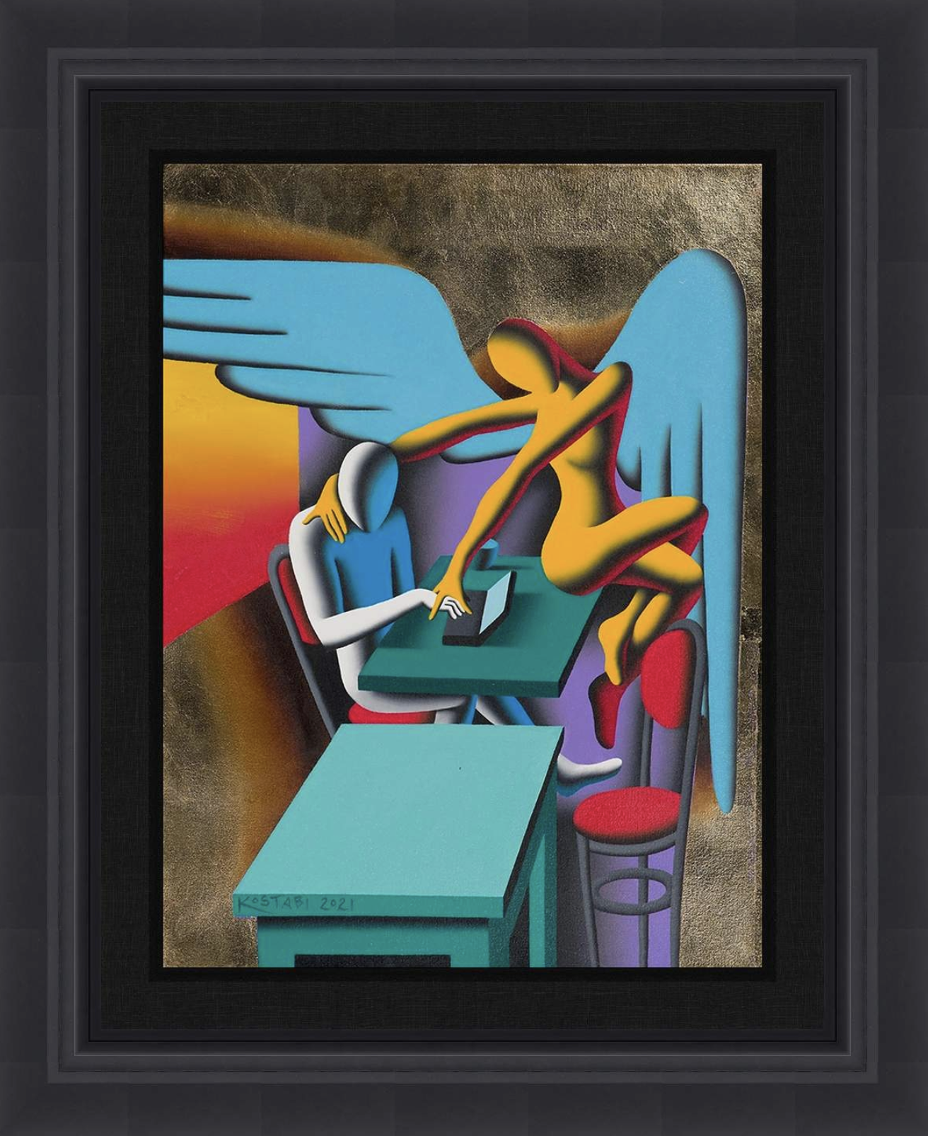 Description of Art: In Spiritual Guidance, Kostabi melds his iconic faceless figures with a metaphysical theme. Two figures stand in quiet posture, one gesturing lightly toward a luminous focal point. The muted palette—deep neutrals offset by touches of gold or light—accentuates the sense of inner calm and transcendence. With softened gradients and minimal detail, the work emphasizes presence over narrative, casting the scene in a contemplative, spiritual aura.