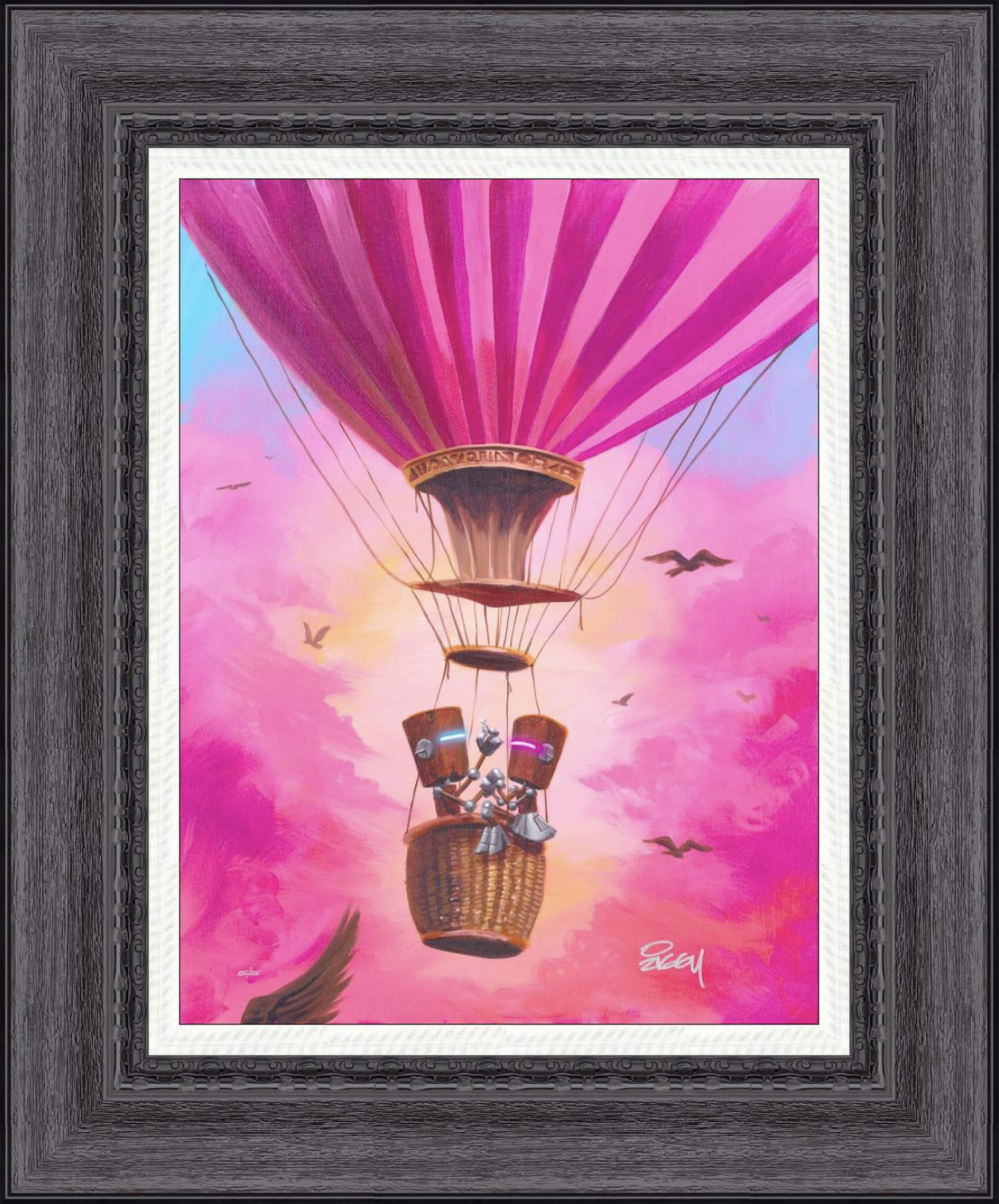 Description of Art: The Proposal presents a dreamlike moment suspended in the sky: two figures—perhaps lovers—are illuminated against a pastel, cottony cloudscape. Ziggy’s signature use of luminous color, soft gradients, and crisp figuration heightens the romantic tension. The work speaks to elevation—emotion lifted above mundane ground—in both subject and visual treatment.