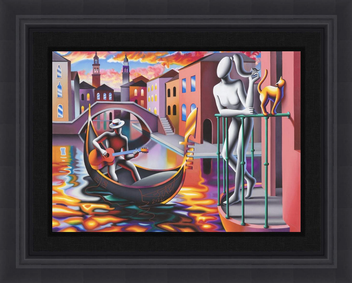 Description of Art: Twilight Serenade evokes a moment suspended between day and night, where silence and melody intertwine. Kostabi presents his hallmark faceless silhouettes—two or more simplified figures—that appear to share or echo a quiet musical communion under the waning light. Their postures, though minimalist, convey a sense of gentle connection: maybe a tilt of the head, an open hand, or mirrored positioning suggesting harmony.