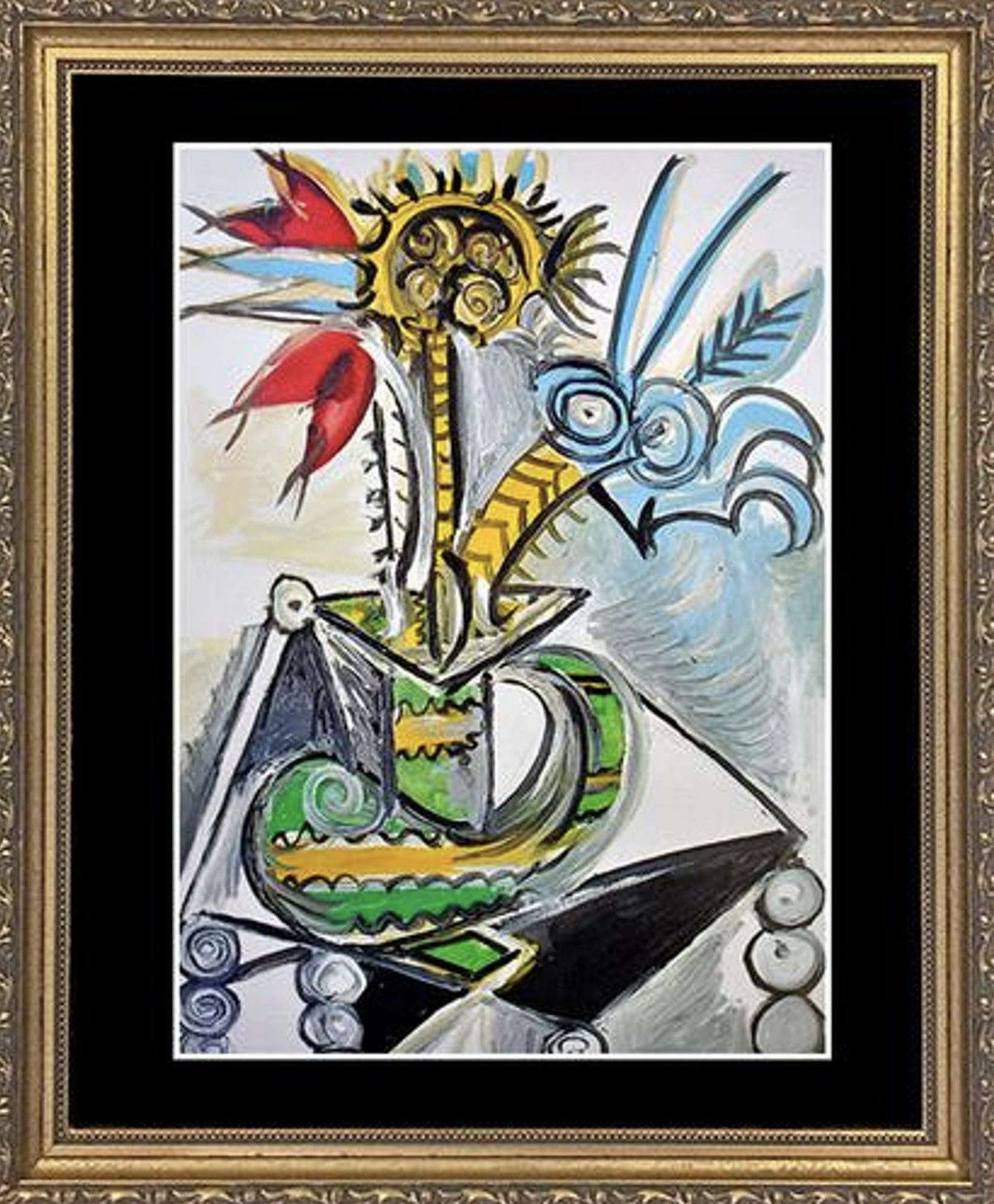Description of Art: In Vase of Flowers on a Table, Picasso combines floral still life with architectural structure to create a balanced, pictorial arrangement. A bouquet rests in a vase atop a table draped with cloth, while the composition is anchored by simplified forms and planar subdivisions. The strong, decisive brushwork and restrained palette—tonal creams, soft greens, and warm neutrals—maintain clarity while allowing the bouquet its presence. Though representational, Picasso’s handling is modern: negative space, flat planes, and subtle shifts in edge quality evoke tension between object and surface. The piece reflects his mastery of translating commonplace subjects into sophisticated, poised formal studies.